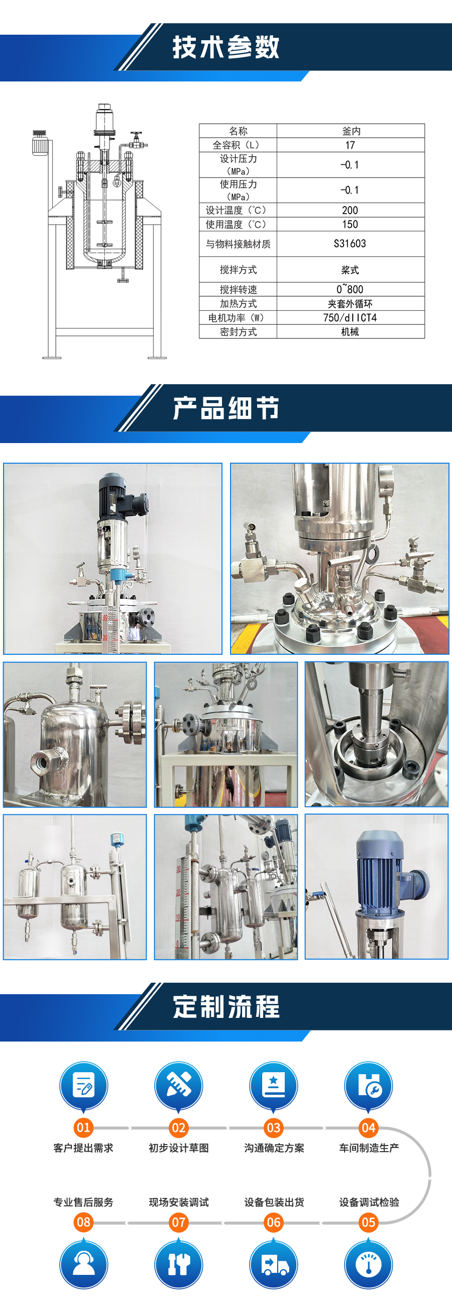 如果用戶在釜蓋、釜體開口、內(nèi)部結(jié)構(gòu)、壓力高低、攪拌槳葉、及增加其他輔助裝置(如冷凝回流裝置、冷凝器、恒壓加料罐、接收裝置)等有特殊要求,可完全按用戶的要求加工制造 |
