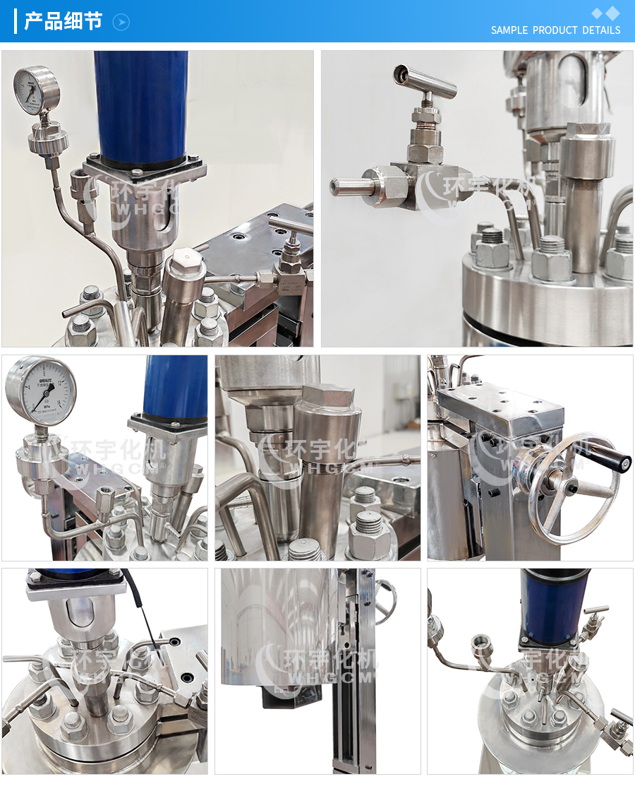 常規(guī)釜蓋開口 氣相口配針形閥,液相口配針形閥及釜內(nèi)插底管,固體加料口配絲堵,測控溫口配鉑電阻,壓力表安全爆破口配壓力表及安全防爆裝置,釜內(nèi)冷卻盤管進、出口配水咀