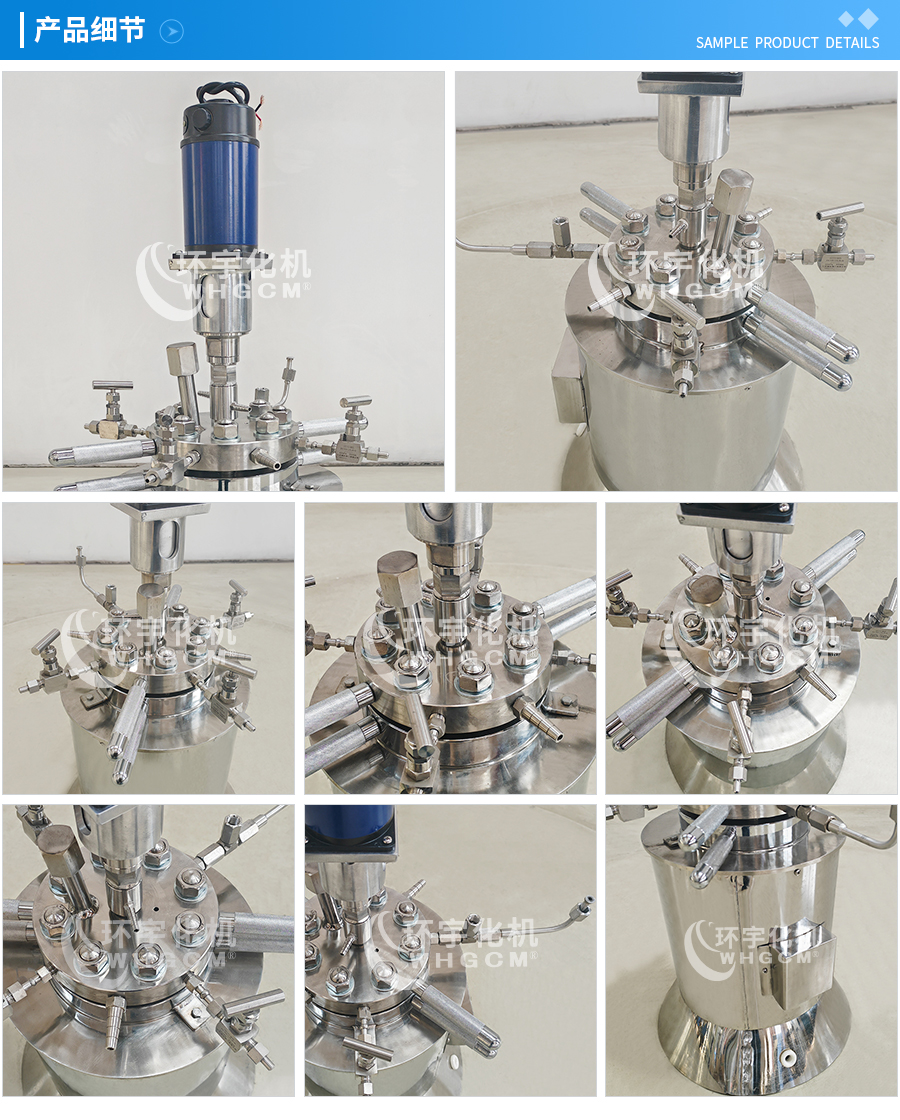 常規(guī)釜蓋開(kāi)口 氣相口配針形閥,液相口配針形閥及釜內(nèi)插底管,固體加料口配絲堵,測(cè)控溫口配鉑電阻,壓力表安全爆破口配壓力表及安全防爆裝置,釜內(nèi)冷卻盤管進(jìn)、出口配水咀