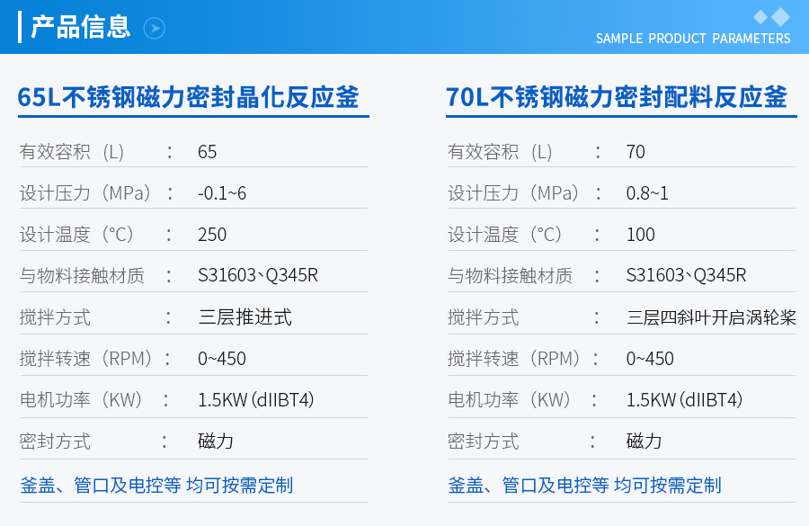 | 主要材料 | 釜體材料主要采用不銹鋼與碳鋼復(fù)合材質(zhì) S30408(304)+Q345R、S31603(316L) +Q345R、S32168(321)+Q345R, 也可是純不銹鋼材質(zhì),并可根據(jù)不同介質(zhì)要求制作鈦材、鎳材、鋯材、哈氏合金、蒙耐爾合金等復(fù)合材質(zhì)反應(yīng)釜,也可根據(jù)客戶要求主要材料噴涂四氟PTFE/PPL | ||||